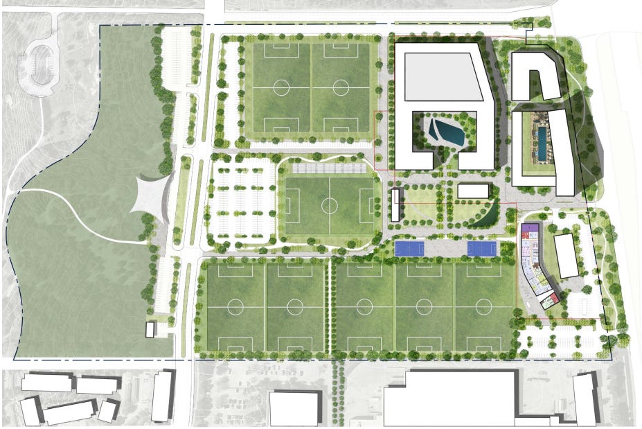 The dream of professional soccer comes closer to reality as staff presents lease terms for a $70M+ multipurpose soccer facility near Holford Road and the Bush Turnpike. The complex includes eight fields including one “Show Pitch” with artificial turf, two training fields with hybrid turf, five academy fields with two artificial & three natural (TBD), a restroom and concession building, two futsal courts, a 28,000-sf training center, and a lease term of 20 years.