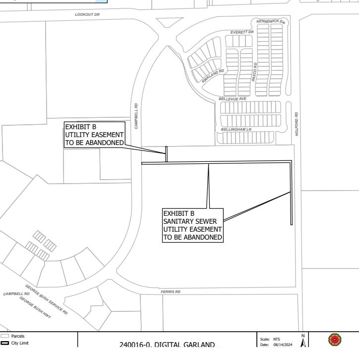 Council is requested to consider the abandonment of a Utility Easement and a Sanitary Sewer Utility Easement in the Digital Realty subdivision to the current property owner, Digital Garland Campbell, L.P. Unless otherwise directed by Council, this item will be scheduled for formal consideration at the June 3, 2025 Regular Meeting.